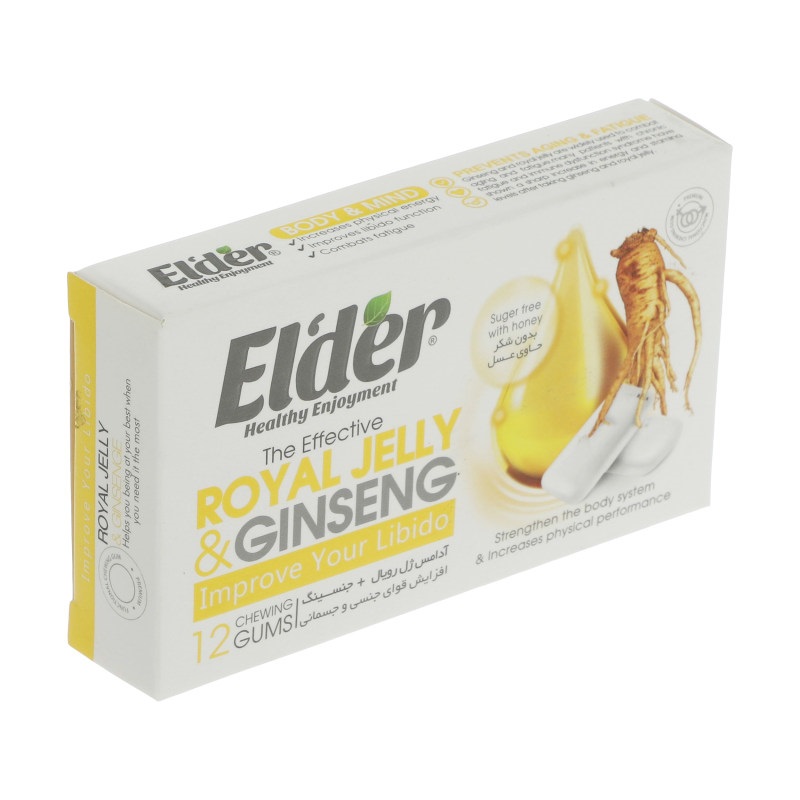 آدامس جینسینگ و ژل رویال الدر افزایش قوا و عملکرد جسمانی: جینسینگ ریشه گیاهی نام علمی Panax Ginseng است. Panax مشتق از کلمه Panacea به معنی درمان برای همه بیماری ها و منبع طول عمر و قدرت فیزیکی است. ترکیبات موثره گیاه جینسینگ شامل ساپونین ها و یا گلیکوزیدهای تریترپنوئید است که مجموعا به عنوان جینسنوزیدها شناخته می شوند. جینسینگ دارای آثار متعدد فارماکولوژی اعم از افزایش دهنده قوا، ضد پیری و ضد خستگی است. ژل رویال ماده ای منحصر به فرد برای تغذیه زنبور ملکه است که حاوی پروتئین ها، قندها، لیپیدها، آمینو اسیدهاف ویتامین ها، مواد معدنی و HAD-10 است و ماده طبیعی برای بهبود میل است.. شناسایی حضور ماده HAD-10 در ژل رویال استفاده شده در آدامس جینسینگ و ژل رویال الدر بر اساس استانداردهای بین المللی به عنوان یک آنالیز مربوط به تعیین اصالت ژل رویال تضمین کننده استفاده از ژل رویال واقعی و در نتیجه اثر بخش بودن این آدامس به عنوان یک مکمل افزاینده قوا و عملکرد جسمانی است. شایان ذکر است جهت حفظ خواص ژل رویال در این آدامس به جای شکر از عسل طبیعی استفاده شده است. ترکیب ژل رویال و جینسینگ در آدامس های ژل رویال و جینسینگ الدر یک تقویت کننده طبیعی قوا برای هر دو جنس مرد و زن، آنتی اکسیدانت، جوان کننده و همچنین نیرو بخش و ضد خستگی است.