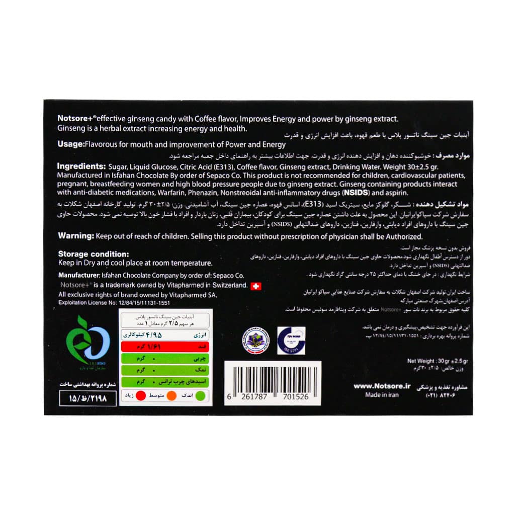 آبنبات جین سینگ ناتسور با طعم قهوه به عنوان یک انرژی زای طبیعی شناخته میشود و به کاهش خستگی و بهبود تمرکز کمک میکند. آبنبات جینسینگ به خنک کردن مجاری تنفسی و خوشبو کردن دهان کمک کرده و برای ذائقههای مختلف مناسب بوده و حس آرامش بخش و خوشایندی را به همراه دارد. این محصول به دلیل داشتن جینسینگ در افزایش قوای ج-ن-س-ی نیز موثر است. در ترکیبات این محصول از گیاه استویا شامل استویوزید و ربودیوزید A استفاده شده است که چندین برابر شیرینتر از شکر است و کالری بسیار کمتری دارد. شایان ذکر است فرمولاسیون آبنبات نات سور جینسینگ توسط لابراتوار ویتافارمد سوئیس تایید شده است.