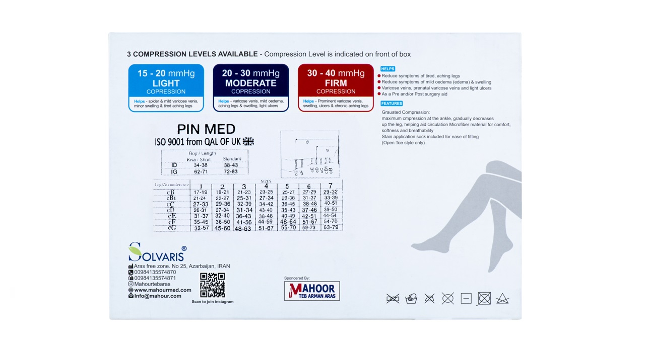 تکنولوژی جوراب واریس SOLVARIS به شکلی است که جوراب در قسمت تحتانی و مچ تنگ طراحی شده و هرچه بالاتر می اید گشاد تر می شود. این طراحی خاص موجب میشود.خون تجمع یافته در انتهای اندام به راحتی به سمت بالا حرکت کرده و به قلب بازگردد. استفاده از جوراب واریس(SOLVARIS) یکی از مطمئن ترین راهکارها برای جلوگیری از ایجاد واریس است.