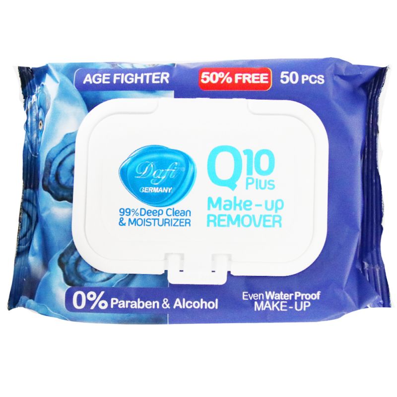 دستمال های مرطوب های متعددی در بازار موجود می باشند، اما برخی از این دستمال ها دارای رایحه تند و همچنین الکل می باشند که پوست را آزار داده و در برخی موارد دچار حساسیت می کنند. دستمال مرطوب آرایشی دافی مدل Age Fighter حاوی Q10 با توجه به فاقد پارابن و الکل بودن و استفاده از مواد طبیعی در ساخت خود، ابدا ایجاد حساسیت نمی کند و سبب شادابی پوست میگردد. علاوه بر این، دستمال مرطوب دافی حاوی عصاره آلوئه ورا، عصاره گل گیلاس ژاپنی و روغن جوانه گندم نیز می باشد که از التهابات پوستی جلوگیری کرده و پوست را تغذیه می کند. این محصول حاوی خواص ضد پیری می باشد و مناسب اتواع پوست است.