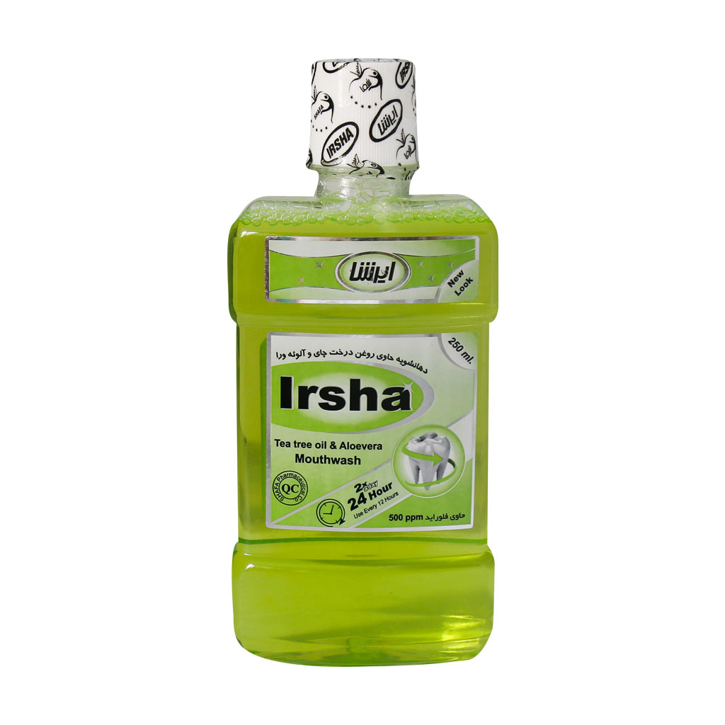 دهانشویه حاوی روغن درخت چای و آلوئه ورا ایرشا فاقد الکل بوده و برطرف کننده جرم و پلاکهای دندان است. استفاده از دهانشویه آنتی باکتریال ایرشا موجب حفاظت از لثه و دندان نیز میشود.