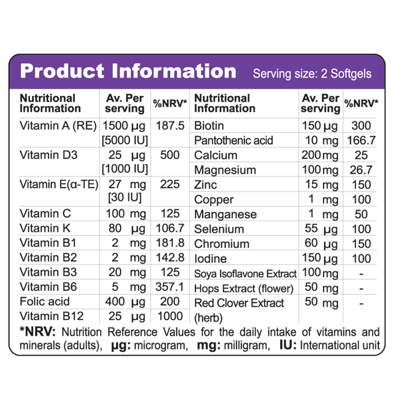 حاوی عصاره شبدر قرمز، ایزوفلاوون سویا و عصاره رازک برای کاهش علائم یائسگی به ویژه گرگرفتگی و تعریق شبانه