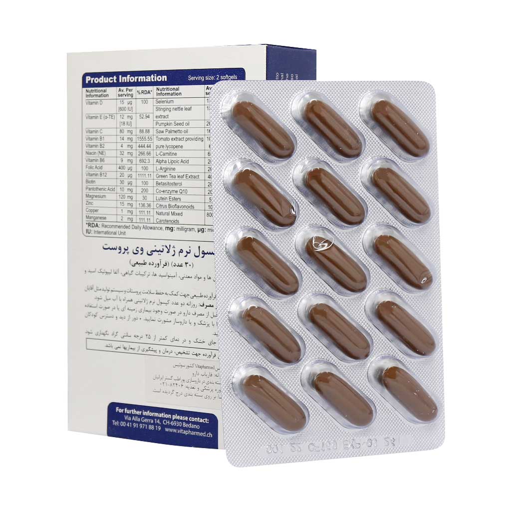 ویتامینها: ویتامین سی یک جایگزین برای آنتی بیوتیکها با هدف درمان پروستات است. این ویتامین یک حامی قوی برای سیستم ایمنی بوده و به مبارزه با عفونتهای احتمالی کمک میکند. ویتامین B۶ که عملکرد دیگر مواد مغذی را نیز بهبود میبخشد، باعث کاهش سطوح پرولاکتین میشود. چرا که پرولاکتین تبدیل تستوسترون به DHT را کند میسازد. بیوتین، پانتوتنیک اسید، ویتامین D و سایر ویتامینهایی که در سافت ژل وی پروست ویوا تیون یافت میشود تماما به حفظ سلامت پروستات کمک مینمایند.