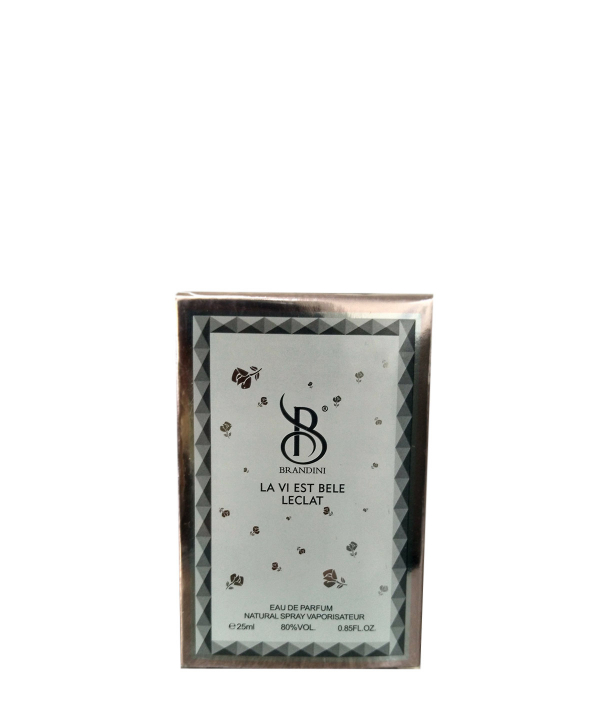 عطر جیبی زنانه برندینی Brandini مدل La Vi Est Bele Leclat حجم 25 میلیلیتر یکی از عطرهای تولید شده توسط این برند است که از نتهای ترنج، پرتقال ماندارین، فریزیا، شکوفه پرتقال، یاس سفید، زنبق، گلهای سفید، چوب معطر صندل، وانیل و پاتچولی (نعنای هندی) تشکیل شده است و ماندگاری مناسبی بر روی پوست دارد. این عطر مناسب فصل پاییز و بهار است.