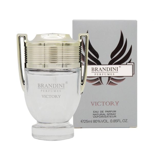 عطر جیبی مردانه برندینی مدل VICTORY با رایحه خنک، گل، مرکبات و چوب ماندگاری و پخش بوی بسیار زیاد داشته و نت بویایی برگ بو، خزه، روایح دریایی، عنبر، لیمو، نارنگی ماندارین، نعنای هندی، چوب گایاک، یاس است.