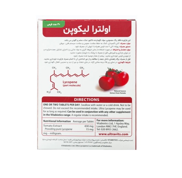 قرص اولترا لیکوپن ویتابیوتیکس حاوی ۲۰۰ میلی گرم عصاره گوجه فرنگی که تامین کننده ۱۰ میلی گرم لیکوپن خالص است.
