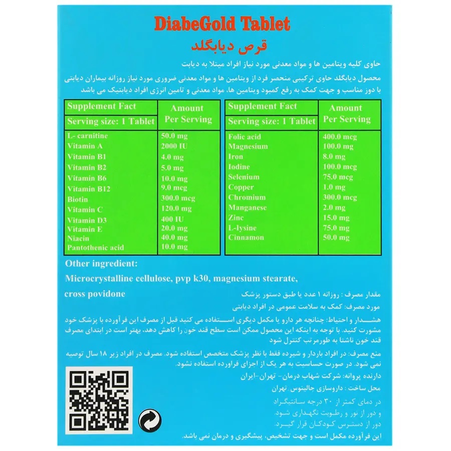 دیابگلد diabe gold یک مکمل غذایی ویژه طراحی شده برای افراد مبتلا به دیابت است که با ترکیبی غنی از ویتامینها، مواد معدنی و آمینواسیدها، نیازهای تغذیهای خاص این افراد را برطرف میکند. این مکمل با هدف بهبود کنترل قند خون، تقویت سیستم ایمنی و ارتقای سلامت کلی افراد دیابتی و پره دیابتی فرموله شده است. دیابگلد در جعبه های مقوایی 45 عددی و بسته بندی شده در 3 بلیستر 15 عددی توسط شرکت داروسازی جالینوس در ایران تولید می شود.