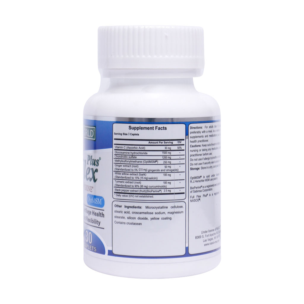 قرص فول فلکس پلاس نچرال ورلد ترکیبی ممتاز از چندین ماده گلوکزآمین، کندروئیتین و MSM (متیل سولفونیل متان) بوده که سبب بهبود و افزایش انعطاف پذیری مفاصل میشود. کندروئیتین جهت ساخت کلاژن که جهت استحکام بافت مفصلی الزامی است، نقش دارد. ترکیب فوق با ممانعت از فعالیت آنزیمهای لیزوزومی و کاهش مواد التهاب زا از بروز آسیبهای احتمالی به غضروف جلوگیری میکند. متیل سولفوئیل متان در بیماران مبتلا به آرتروز در التهاب مفاصل و کاهش درد موثر است.