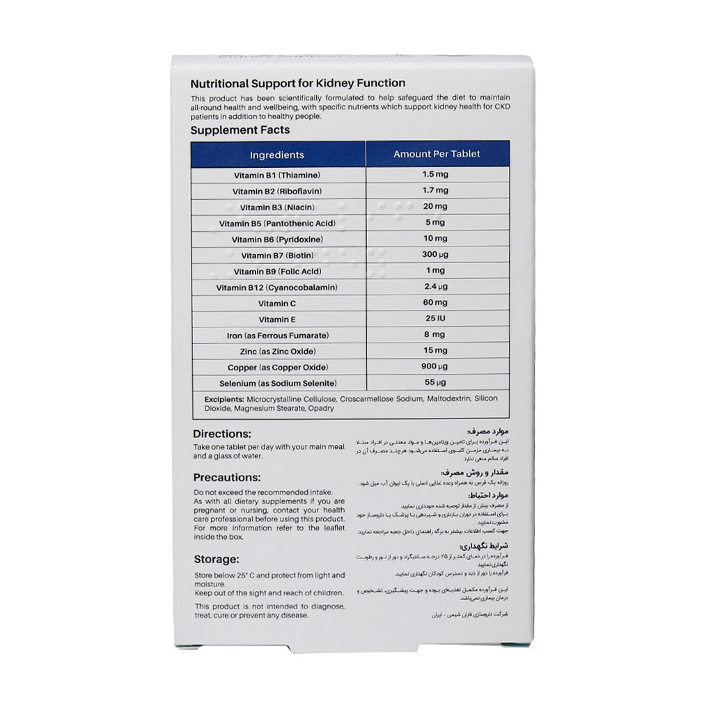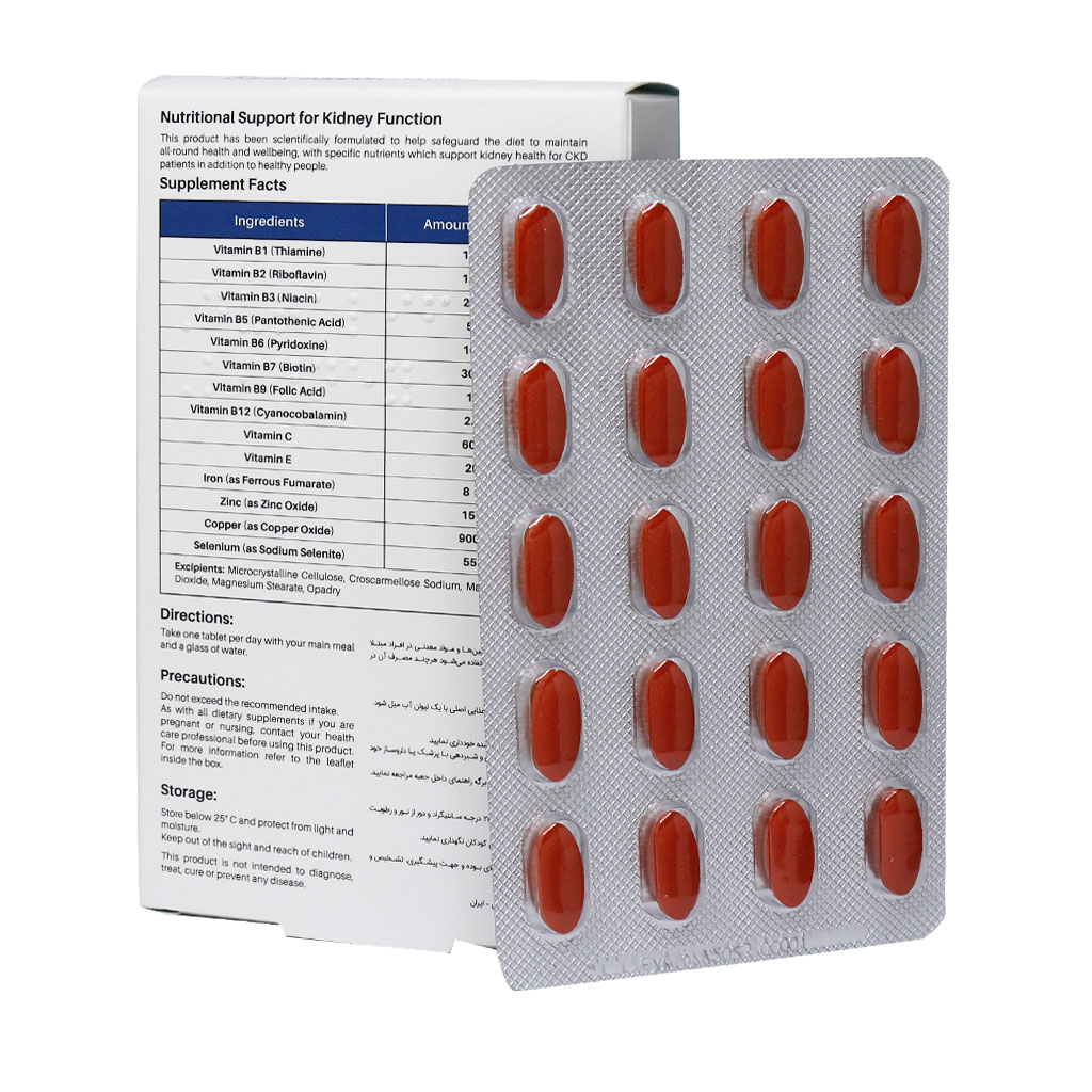 سطح ویتامینهای ب کمپلکس (ب۶، ب ۹ و ب ۱۲) در افراد مبتلا به بیماریهای کلیوی کاهش مییابد اما همان قدر که تامین مقادیر مناسب از این ویتامینها در این افراد حیاتی است مقادیر بالای آنها نیز میتواند در این افراد مضر باشد که این امر در طراحی فرمولاسیون این فرآورده در نظر گرفته شده است. تیامین، ریبوفلاوین، نیاسین، پانتوتنیک اسید و بیوتین در تامین انرژی مورد نیاز بدن موثرند. همچنین تیامین به بهبود عملکرد سیستم عصبی و ریبوفلاوین به بهبود عملکرد سیستم بینایی نیز کمک میکند.