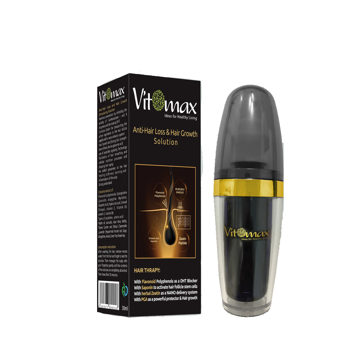 محلول درمانی vitomax با استفاده از انتقال دهنده و ترکیب مواد موثره مختلف و 14 عصاره گیاهی برای درمان تاسی، رویش مجدد ، افزایش تراکم ، رشد قدی ، ضخامت تار و ضد ریزش مو آقایان و خانمها استفاده میشود.