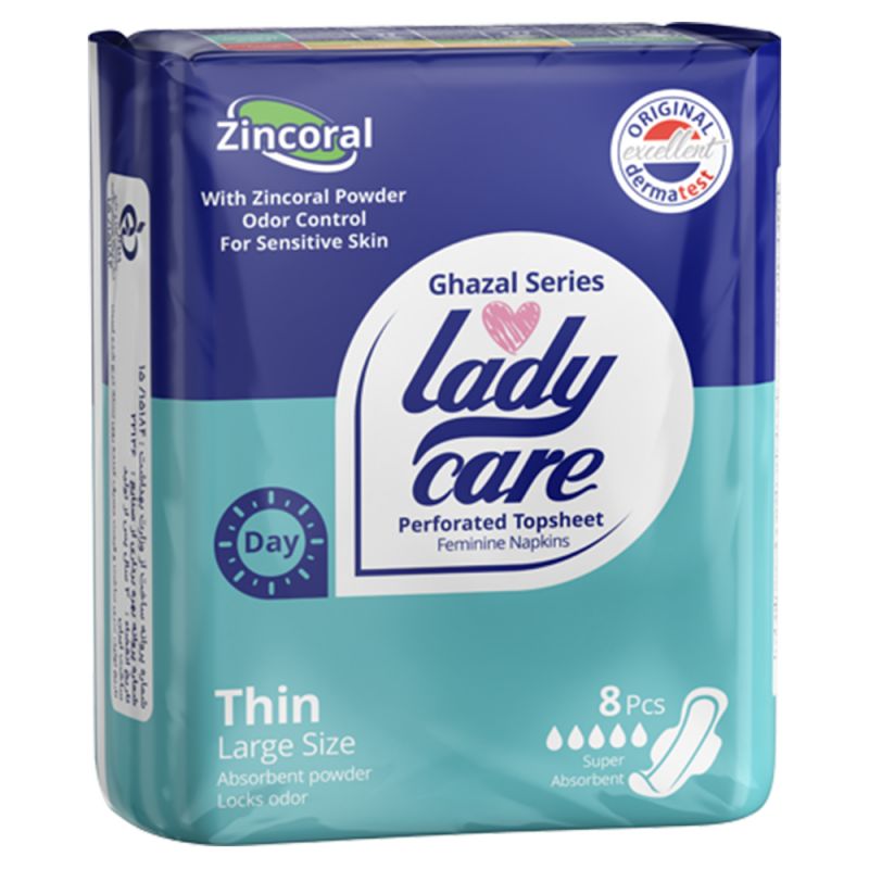 نوار بهداشتی لیدی کر سری غزال مدل نازک سایز بزرگ بسته 8 عددی مناسب برای استفاده در روز با جذب بالا و حاوی 10 عدد در هر بسته است. سایز بزرگ و لایه نازک این محصول این اجازه را به مصرف کننده می دهد که با خیالی آسوده به فعالیت های خود بپردازد، هر چند نوار بهداشتی های سایز بزرگ بیشتر برای استفاده در روز می باشند اما چنانچه میزان خون ریزی زیاد باشد می توان از آنها در طی شب نیز استفاده کرد. این محصول حاوی پودر زینکورال (ضد بو و بدون ایجاد حساسیت و التهاب) می باشد و با جذب بالای مایعات، هیچگونه حساسیتی ایجاد نمی کند و با لایه های نازک و قدرت جذب بسیار بالا نشت مایع را به حداقل می رساند.