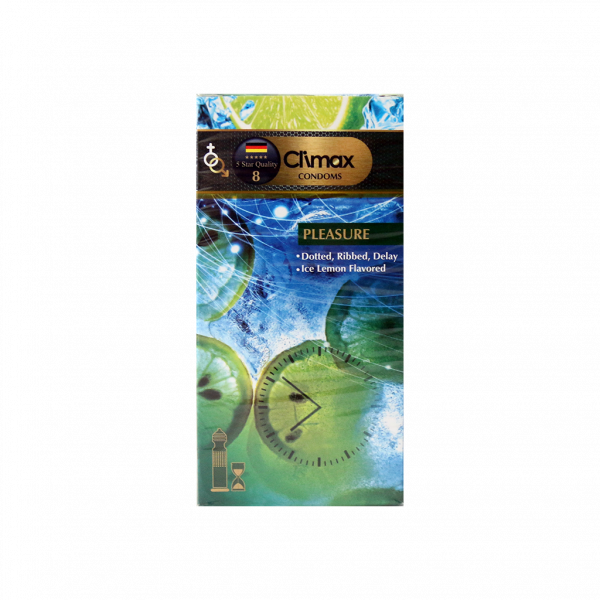 کاندوم تاخیری ، خاردار و شیاردار کلایمکس مدل Pleasure کاندوم طرح دار ترکیبی (شیار دار و خاردار) می باشد که همراه با مواد روان کننده و تاخیری است. پهنای این محصول حدود ۵۳ میلی متر بوده و از لاتکس طبیعی ساخته شده است.