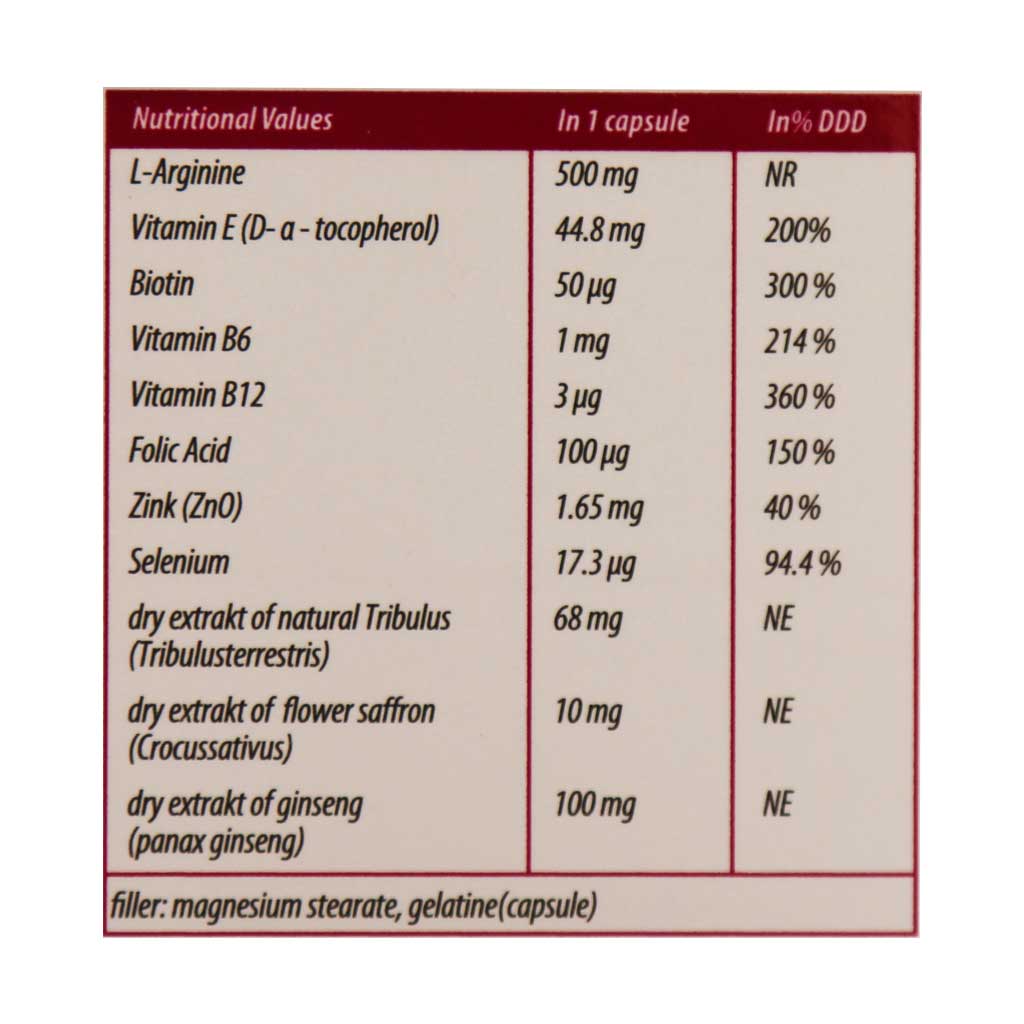 ال آرژنین، ال سیترولین، گیاه تری بولوس، زعفران، عصاره ال سیترولین به عنوان مواد جنسی، میل جنسی و محرک فعال موجود در این فرآورده باعث افزایش جریان خون در اندام تناسلی، افزایش تحریک و افزایش میل جنسی، افزایش میزان شور و هیجان، رسیدن به اوج لذت جنسی و بهبود تورم مهبلی میشود. لوتئین، بیوتین، ویتامین E و سایر ویتامینهای مصرفی در این فرآورده، اسید فولیک، سیانوکوبالامین، سلنیوم و زینک به عنوان مواد محافظ فعال باعث کمک به حفظ و تحکیم دیواره عروق، حفاظت بافت اندام تناسلی و کاهش اثرات منفی پیری رگها میگردد.