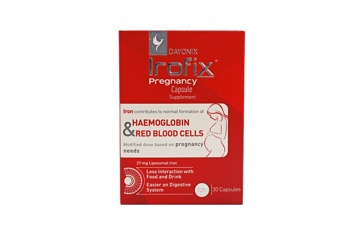 کپسول دایونیکس آیروفیکس بارداری فارما 30 عددی Dayonix Irofix pregnancy 30 Capsules، دربردارنده ی آهن پیروفسفات لیپوزومال است که میتواند به بانوان باردار در کم خونی و جلوگیری ناشی از فقر آهن کمک کند و آهن مورد نیاز روزانه ی این عزیزان را فراهم سازد.